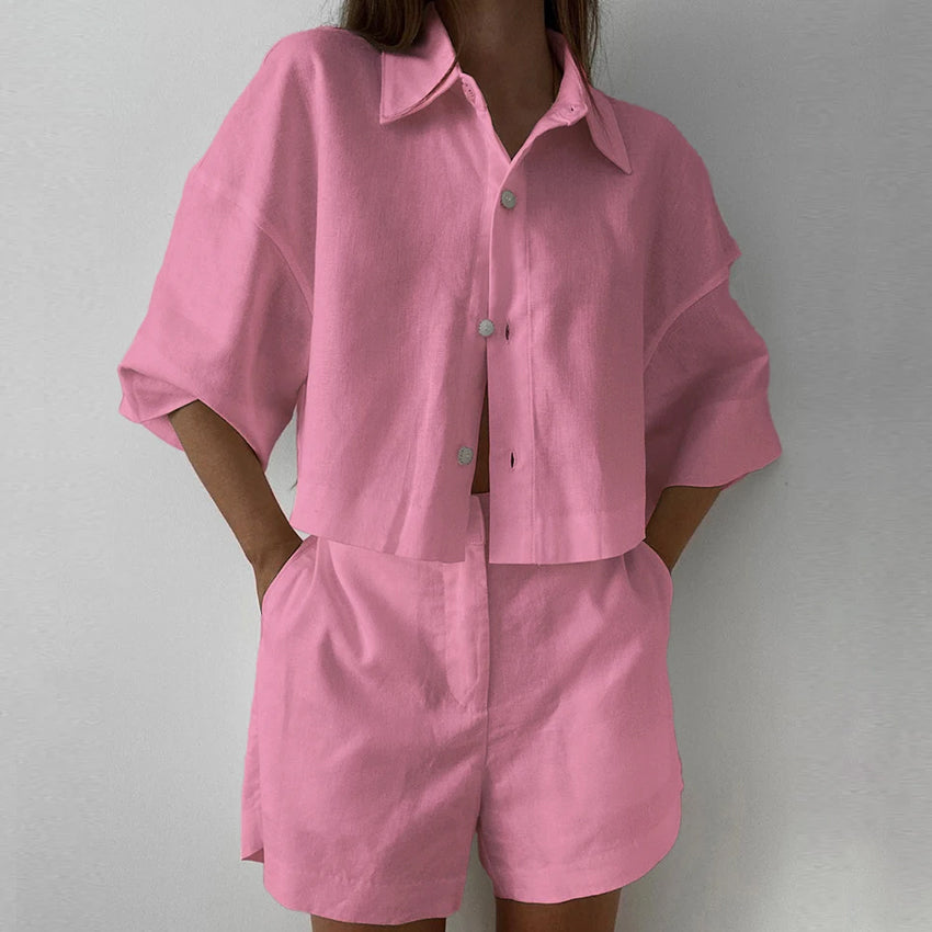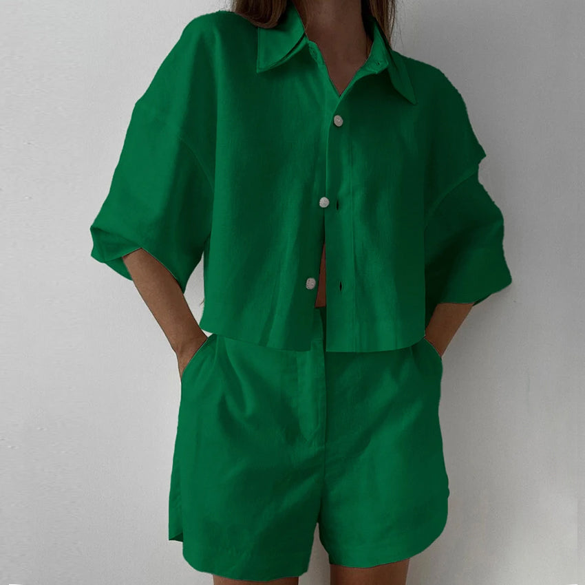 Effortless elegance meets summer vibes in the Olivia Klein Effortless Summer Duo Set. The crisp white fabric exudes sophistication, while the high-waisted shorts and button-down shirt add a touch of playful charm.